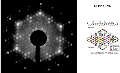 En un esquema de óptica LEED se ve que los electrones primarios inciden normalmente sobre la muestra. Los electrones provenientes de la muestra (difractados hacia atrás) viajan rectilíneamente por una región libre de campo, hasta llegar y atravesar un montaje de rejillas hemisféricas concéntricas. La primera rejilla se encuentra al potencial de tierra, al igual que la muestra, de modo que los electrones difractados no se ven alterados en el espacio también libre de campos entre ambas. La segunda y tercera rejilla están a un potencial negativo cuya magnitud es algo inferior a la energía primaria de los electrones. De esta forma, todos los electrones dispersados inelasticamente son detenidos. Tras atravesar la tercera rejilla los electrones difractados elásticamente son acelerados hacia la pantalla fluorescente, que se encuentra a un potencial positivo de unos 5 keV. La cuarta rejilla se encuentra a tierra igual que la primera, para evitar in homogeneidades del campo eléctrico. Los electrones reacelerados hacia la pantalla aseguran una imagen fluorescente del patrón de difracción quese observa directamente a través de las rejillas por detrás de la muestra. La comparación de un esquema del experimento LEED con la construcción de Ewald bajo las mismas condiciones nos muestra claramente como el patrón de difracción observado es, sencillamente, una proyección de la red reciproca magnificada según la energía de los electrones, es decir una serie de puntos o manchas (spots) con la simetría del espacio reciproco correspondiente. |