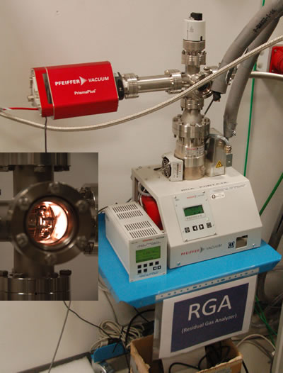 En la fotografía vemos el espectrómetro de masas montado sobre una pequeña cámara de vacío. Vemos en la ampliación el efecto del encendido del filamento para la creación de iones que provienen de los gases de la cámara MARTE. |