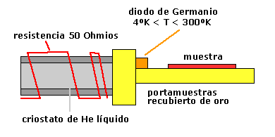 El interior del portamuestras en PASC, cuenta con un diodo de Germanio, para el control de la temperatura. En este caso el valor de la resistencia del diodo es función directa de la temperatura, en un rango de 4ºK a 300ºK. Este diodo esta fijo al manipulador y en contacto con el, de manera que sirve para que la centralita de control de temperatura envíe mayor o menor intensidad a la resistencia eléctrica, que enrolla toda la barra del criostato, para mantener la temperatura a un valor constante durante toda la fase de los experimentos. |